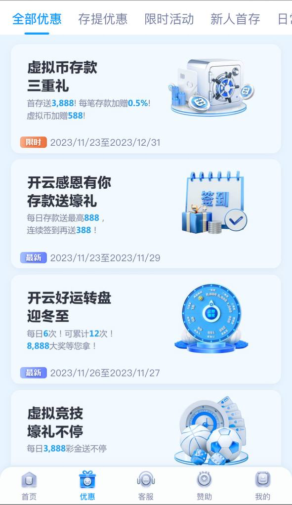 开元体育 是目前同类平台当中给予用户最大优惠的服务供应商。开元体育 有许多的活动,例如首存优惠、充值奖励、VIP等级活动、每周/月返利以及一些挑战活动等,所有活动注册后可以在网站内的“优惠”专区看到,通过网页或应用即可参与。如有疑问,可联系网站内24小时在线客服进行交流沟通。